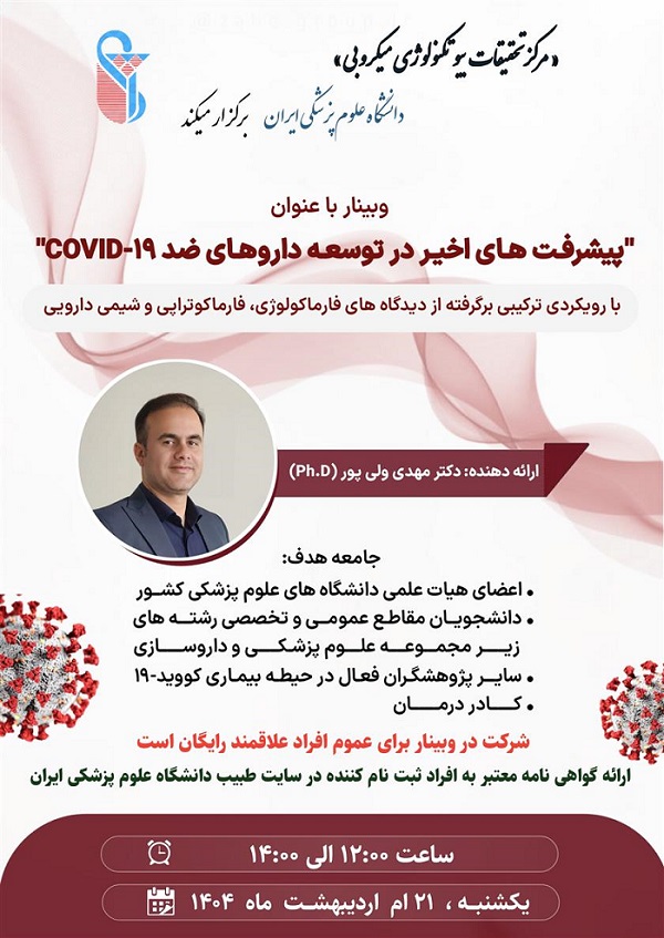 دانشگاه علوم پزشکی ایران، وبیناری با عنوان  پیشرفت های اخیر در توسعه داروهای ضد ۱۹-COVID را برگزار می نماید.