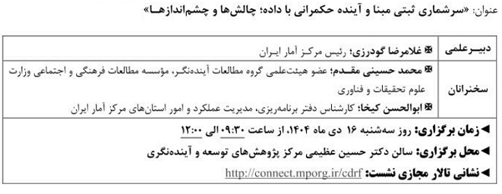 نشست علمی سرشماری ثبتی مبنا آینده حکمرانی با داده ۱۴ دی ۱۴۰۴ | ۱۰:۲۱ کد : ۵۷۴۱۸ اطلاعیه ارسال به دیگران نام شما ایمیل شما ایمیل دریافتکننده ارسال انصراف تعداد بازدید:۹۳۹ دویست وسی وهفتمین نشست علمی - تخصصی با عنوان سرشماری ثبتی مبنا آینده حکمرانی با داده، چالش ها وچشم اندازها